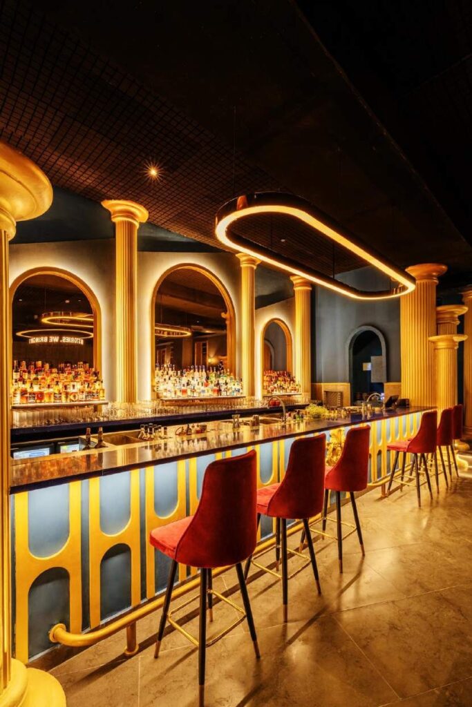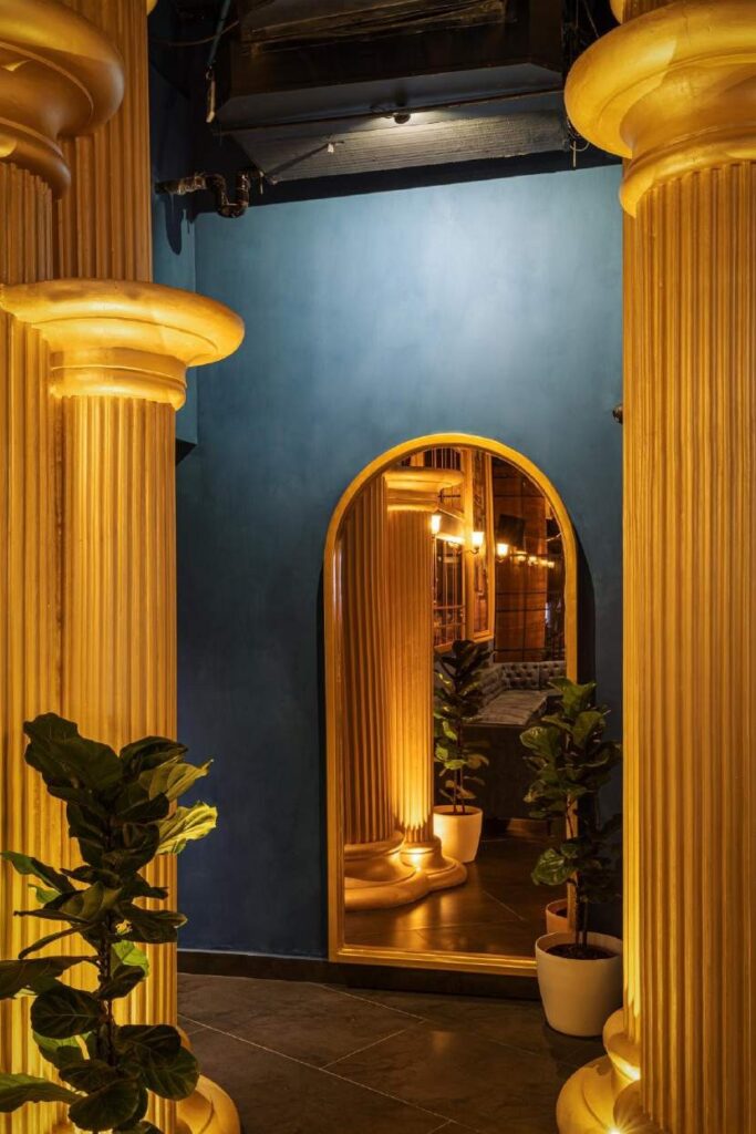 The restaurant’s entryway is designed to make a lasting impression. A grand and dramatic entrance sets the stage for the entire dining experience. Drawing inspiration from Greek architectural features such as stately columns, intricate arches, and ornate detailing, the entrance exudes a sense of grandeur that entices guests to explore further.