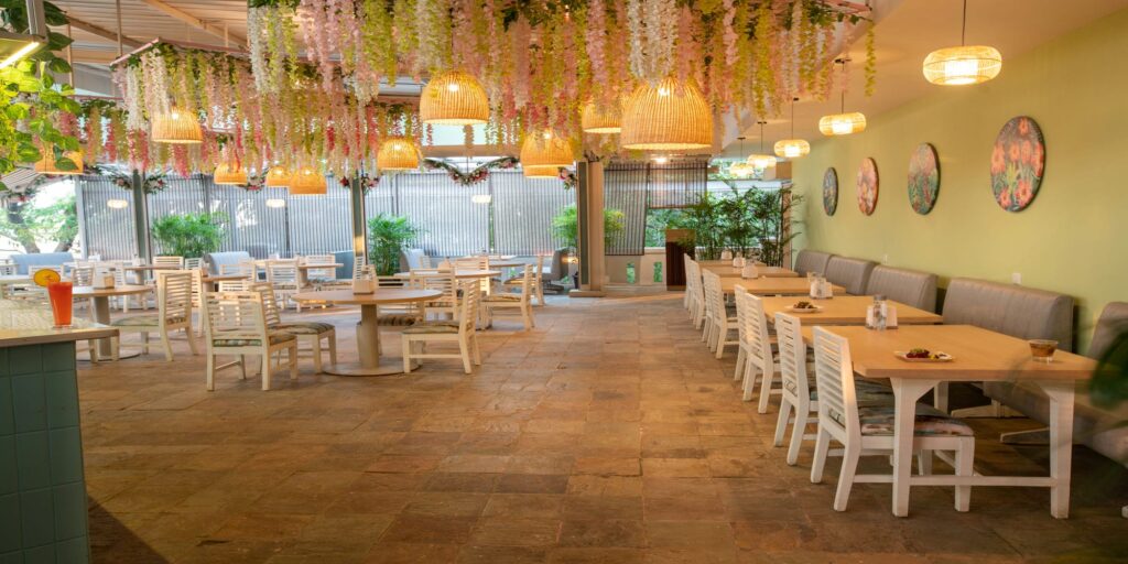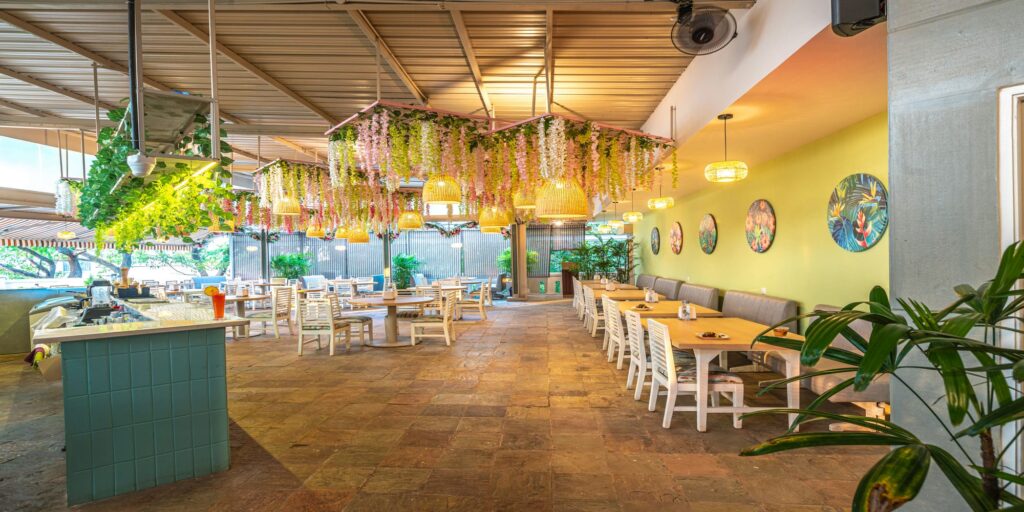 The 12-foot high ceiling, ornamented with mesh modules adorned with creepers and cane lighting elements, takes center stage in the spacious indoor dining area. A large brick-clad bar counter, finished in teal paint, is highlighted by an overhanging unit filled with greenery, creating an ever-blooming floral ambiance. The wall tiles are elegantly covered with pastel green painted gypsum boards embellished with flower art, further enhancing the relaxing atmosphere infused with Japanese characteristics. Additionally, a row of blinds decorates the exterior, adding to the cool and calm ambiance of the space.