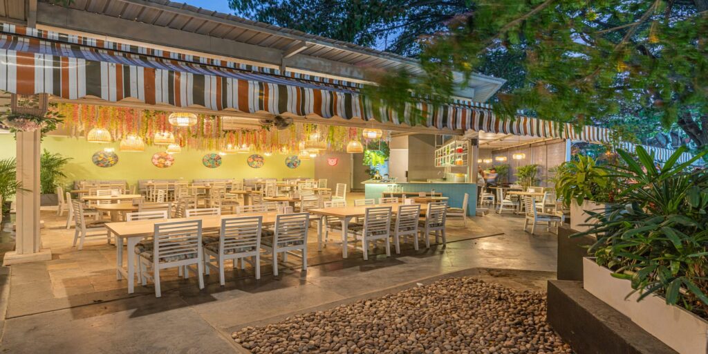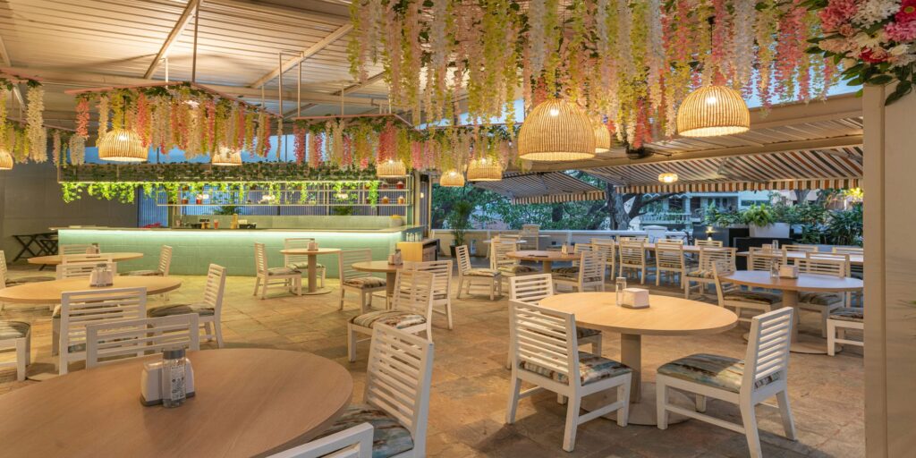 “Diners can relish the verdant beauty of Jayanagar while enjoying their meal in the outdoor seating area, shaded by sun-shading elements”