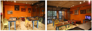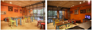 Kannada and Hindi movie posters with funny quotes amidst the orange painted wall entertain and bring character to the space. Glass partitions have been used to separate the indoor and outdoor dining space providing different and interesting focal point of views for its users. This was also done to make the place livelier by attempting to let in more natural light. So, let loose the Indian in you and come celebrate with a cup of tea.